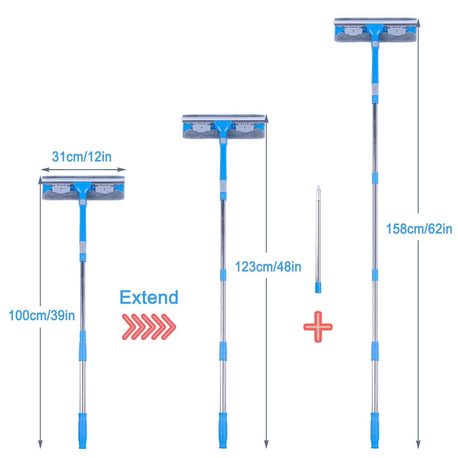 Telescopic Handle: The high quality stainless steel pole could be extended to 62'' in length, suitable to hold for high places cleaning beyond normal reach. And easy to extend the pole with simple twist-and-lock mechanism. If windows are even higher, more extension poles are available on Amazon, you can search B08CH9MP1H.
