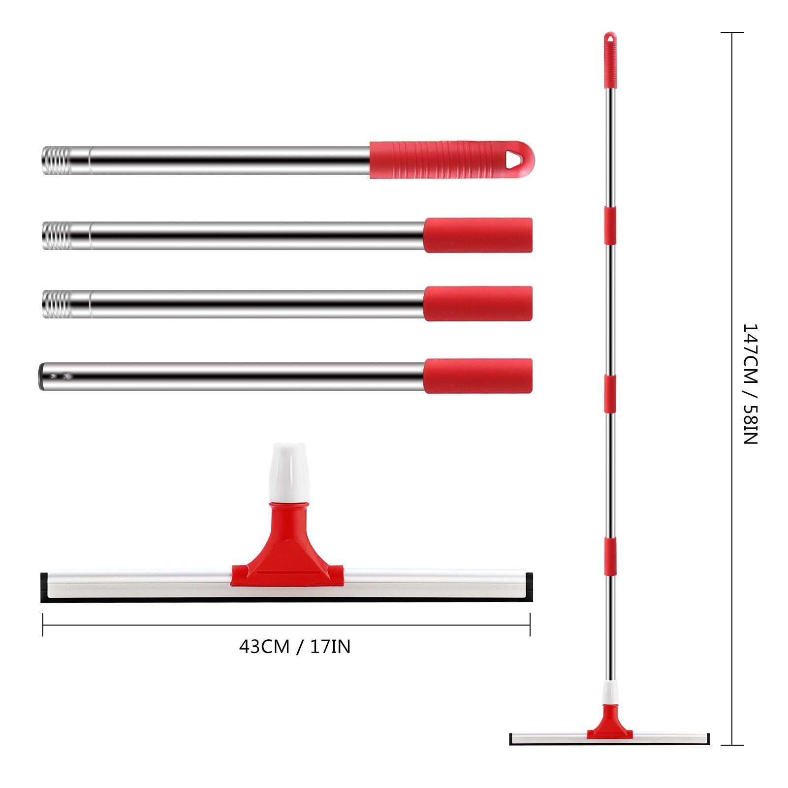 Fast Drying Action: The 17 IN size of the rubber squeegee blade, covering larger area, together with 58 IN long stainless steel handle, works better to clean wide surfaces quickly without leaving water streaks and residue.